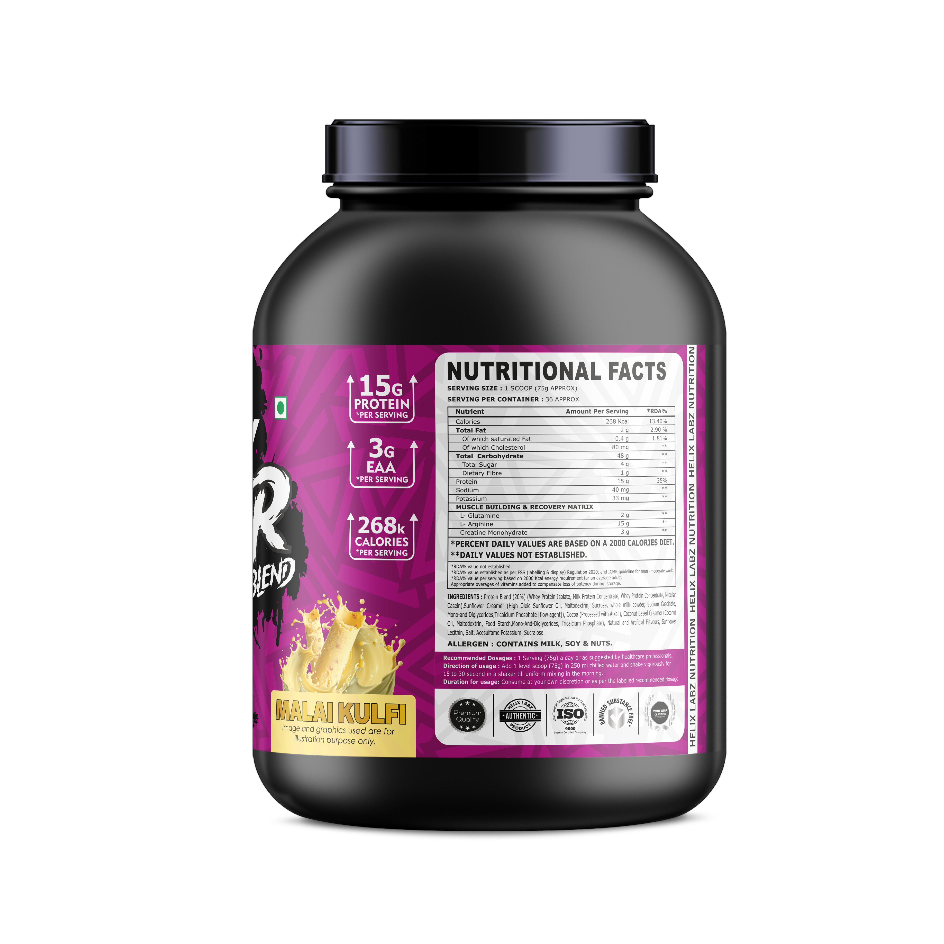 Muscle building and recovery matrix: L-glutamine, L-arginine, creatine monohydrate, whey protein isolate, Milk protein concentrate, high oleic sunflower oil, maltodextrin, sunflower creamer, mono &di glyceridestricalcium phosphate, acesulfam potassium, sunflower lecithin.